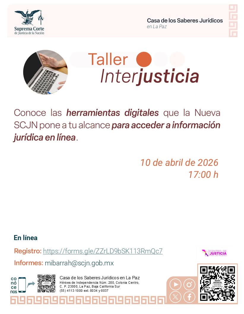 La Casa de los Saberes Jurídicos y la #PGJEBCS a través del #CJM te invitan al taller InterJustic...